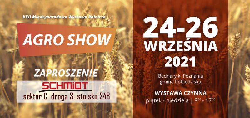 Już w najbliższy weekend w dniach 19-22 września odbędzie się nawiększa w Europie plenerowa wstawa urządzeń rolniczych AGRO SHOW. Podczas imprezy firma SCHMiDT zaprezentuje Państwu wózki widłowe oraz ładowarki czołowe i miniładowarki z szeroką gamą osprzętu roboczego - niezastąpione przy codziennej pracy w każdym gospodarstwie.
